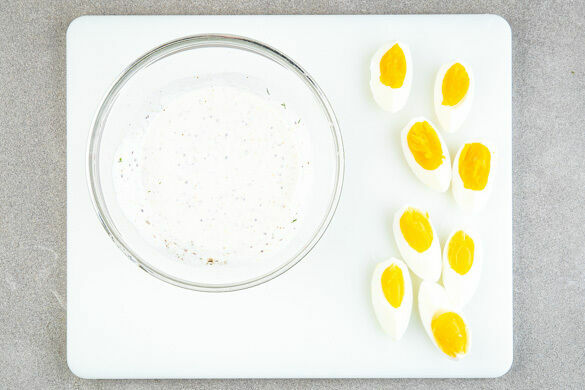 Das Wasser erneut aufkochen, dann vorsichtig die Eier hineingeben und 7–8Min. kochen, bis sie hart sind. Die Eier aus dem Topf nehmen und eine Schüssel mit kaltem Wasser legen.