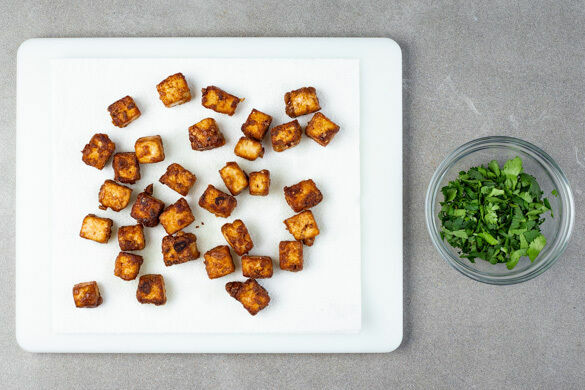 Den Tofu in 1EL Speisestärke oder Mehl wenden und in einer mittelgroßen Pfanne mit 1EL Pflanzenöl bei starker Hitze in 5–8Min. rundum knusprig braten. Auf Küchenkrepp abtropfen lassen und auf einem Teller im Ofen warm halten. Den Koriander samt Stängeln fein schneiden.