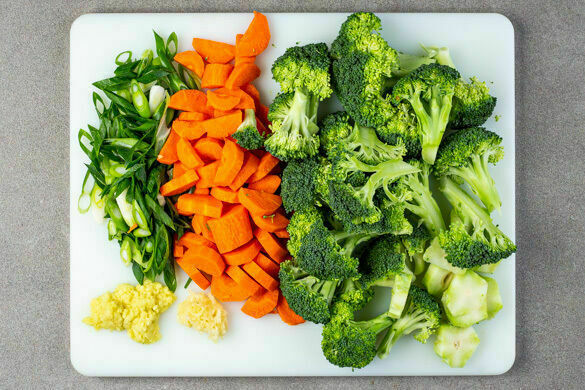 Die Lauchzwiebeln schräg in feine Ringe schneiden. Die Karotten ggf. schälen, längs halbieren und quer in dünne Scheiben schneiden. Den Brokkoli jeweils in mundgerechte Röschen schneiden, die unteren 1–2cm des Strunks abschneiden, den restlichen Strunk ggf. schälen und in dünne Scheiben schneiden.