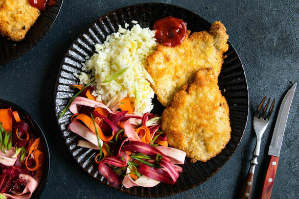 Der japanische Klassiker Tonkatsu ist einfach umwerfend gut, da macht auch unsere Variante mit vegetarischem Bohnenschnitzel keine Ausnahme! Serviert wird der Leckerbissen mit Sushireis, einem knackigen Salat aus bunten Karotten und gelber Bete sowie einem süß-pikanten Sriracha-Dip. Itadakimasu!