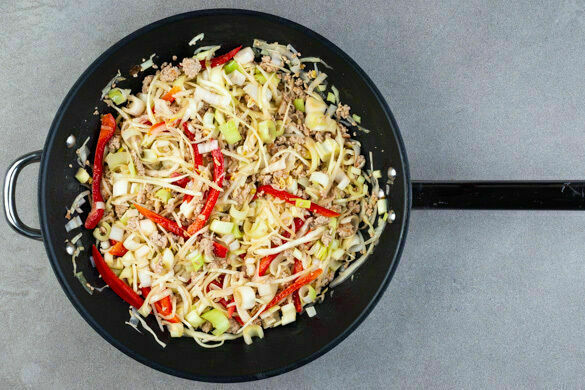 Den restlichen Knoblauch und den weißen Teil der Lauchzwiebeln zu dem Hackfleisch und dem Gemüse in die Pfanne geben. Dann mit dem Ketjap Manis und 100ml Wasser ablöschen und alles noch ca. 5Min. sanft köcheln lassen. Mit der restlichen Sojasauce sowie Salz und Pfeffer abschmecken.
