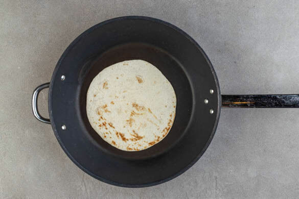 Die Tortillas nacheinander in einer großen Pfanne bei mittlerer Hitze auf jeder Seite 15–20Sek. erwärmen. Alternativ je 4 Tortillas aufeinanderstapeln und bei 800W 25–40Sek. in der Mikrowelle erwärmen.