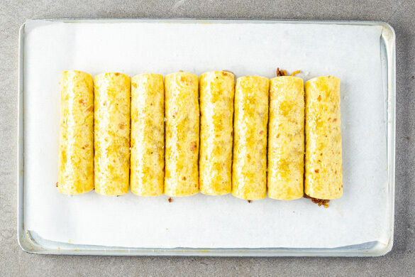 Das Hackfleisch mit dem Käse vermengen. Die Tortillas auf ein mit Backpapier ausgelegtes Backblech legen und auf jeder Tortilla mittig 1EL Hackfleisch-Käse-Mischung verteilen. Die Tortillas straff einrollen, mit 2EL Pflanzenöl beträufeln und die Taquitos mit der Naht nach unten im Ofen in 10–12Min. goldbraun backen.