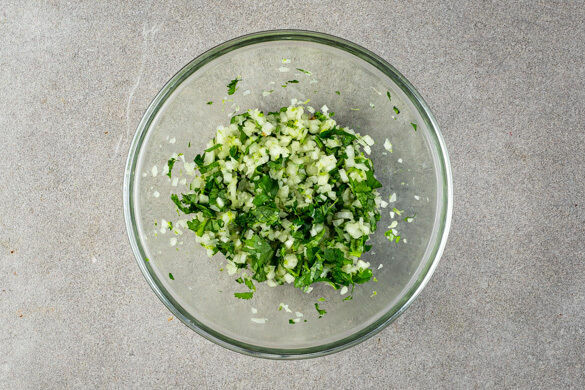 Die Limettenschale abreiben und den Koriander samt Stängeln fein schneiden. Die Zwiebel schälen, halbieren und fein würfeln. Alles zu einem Topping vermengen.