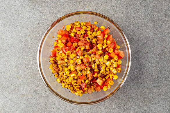 Die Limette halbieren und auspressen. Die Tomate in kleine Würfel schneiden. Den Mais und die Tomaten mit 1EL Limettensaft, ½EL hellem Essig sowie je 1 Prise Salz und Pfeffer zu einem Salat vermengen.