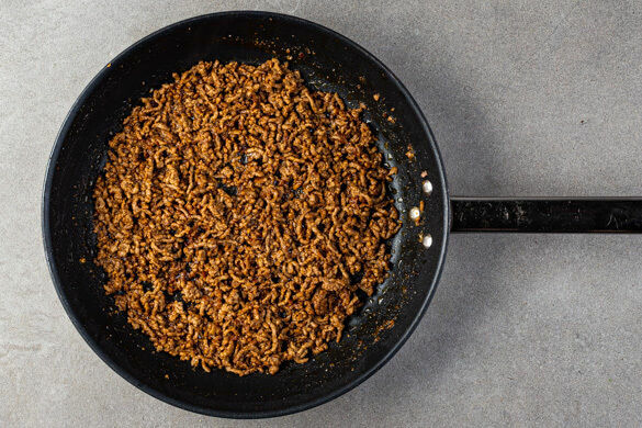 Den Backofen auf 220°C (200°C Umluft) vorheizen. Den Knoblauch schälen und fein würfeln. Das Hackfleisch mit dem Knoblauch, dem Paprikapulver, 2TL Gewürzmischung sowie 1TL Salz und ½TL Pfeffer in einer großen Pfanne mit 2EL Pflanzenöl bei starker Hitze 2–3Min. scharf anbraten.