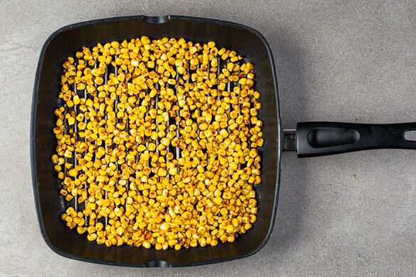 Die Hüllblätter und Fäden entfernen und die Maiskörner mit einem scharfen Messer vom Kolben schneiden, mit 2EL Pflanzenöl sowie je 1 kräftigen Prise Salz und Pfeffer vermengen. Den Mais in einer Grillpfanne oder einer normalen Pfanne ohne Zugabe von Fett bei starker Hitze 4–6Min. grillen, bis Röstspuren zu sehen sind. Den Mais aus der Pfanne nehmen und beiseitestellen.