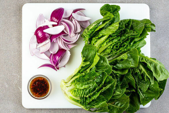 Ggf. den Grill anheizen. 1,5L Wasser in einem Wasserkocher aufkochen. Den Romanasalat jeweils längs halbieren. Die Zwiebel schälen, in 6 Spalten schneiden und die einzelnen Zwiebelschichten voneinander trennen. Die Chiliflocken in 2TL des aufgekochten Wassers einweichen.