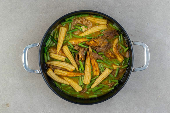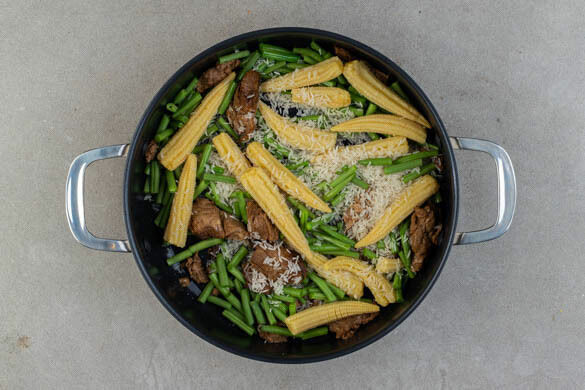 Die Enden der grünen Bohnen entfernen. Das Fleisch trocken tupfen und in einem großen Topf mit 3EL Pflanzenöl bei mittlerer bis starker Hitze ca. 30Sek. anbraten. Dann den Reis, die Bohnen und den Babymais zugeben und ca. 1Min. weiterbraten.