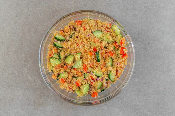 Die Gurke längs vierteln und in kleine Würfel schneiden. Die Zwiebel halbieren, schälen und in feine Würfel schneiden. Die Tomaten grob würfeln. Die Gurke, Zwiebel und Tomaten mit dem Couscous unter das Dressing mengen.