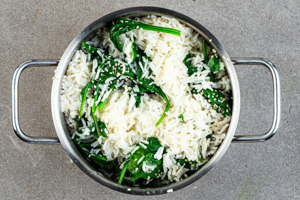 Den zusammengefallenen Spinat mit dem Sesam und 2EL Butter unter den Reis heben. Die Hackpfanne auf dem Spinat-Reis anrichten und mit dem Gurkensalat garniert servieren.