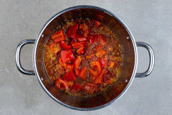 Die Paprika, die Zwiebeln, den Knoblauch und die Chorizo in einem mittelgroßen Topf mit 2TL Olivenöl bei mittlerer Hitze 2–3Min. anbraten, bis das Gemüse weich wird.