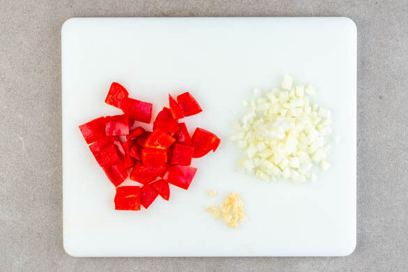 Die Paprika vierteln, entkernen und in grobe Würfel schneiden. Die Zwiebel und den Knoblauch schälen, halbieren und fein würfeln.