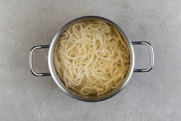 Die Nudeln in das kochende Wasser geben und in 2–3Min. bissfest kochen, dabei zwischendurch umrühren, um die Nudeln voneinander zu trennen. In ein Sieb abgießen und kalt abschrecken.