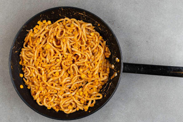 Den Mais in ein Sieb abgießen und abtropfen lassen. In einer mittelgroßen Pfanne ohne Zugabe von Fett bei starker Hitze 3–4Min. anbraten, bis der Mais Röstspuren aufweist, dann herausnehmen. 2EL Butter in derselben Pfanne bei mittlerer Hitze schmelzen lassen. Die ½ der Chilipaste einrühren und langsam 100ml Milch angießen. Den Mais untermengen und die Pfanne vom Herd nehmen.