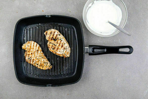 Eine Grillpfanne oder eine normale Pfanne bei mittlerer Hitze erwärmen und das Fleisch auf jeder Seite ca. 4Min. anbraten. Aus der Pfanne nehmen und ruhen lassen. Die Zitronenschale abreiben und mit dem Joghurt und 2EL Mayonnaise zu einem Dip verrühren, mit Salz und Pfeffer abschmecken. Die Zitrone in Spalten schneiden, zum Gemüse auf das Blech geben und kurz mitrösten.