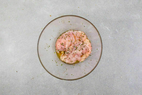 Den Backofen auf 240°C (220°C Umluft) vorheizen. Die Oreganoblätter von den Stängeln zupfen und fein schneiden. 2EL Olivenöl mit 1/2–1TL Oregano sowie Salz und Pfeffer verrühren. Das Fleisch trocken tupfen, längs halbieren und mit dem Oregano-Öl einreiben.