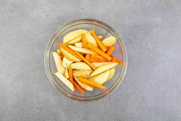 Die Karotten ggf. schälen, quer halbieren und längs in pommesartige Stifte schneiden. Die Kartoffeln samt Schale halbieren und in ca. 1cm breite Spalten schneiden. 2EL Olivenöl mit je 1 kräftigen Prise Salz und Pfeffer verrühren und das Gemüse untermengen.