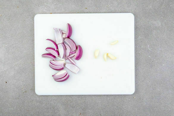 Die Zwiebeln schälen, halbieren und jede Hälfte in 3–4 Spalten schneiden. Den Knoblauch schälen und längs halbieren.