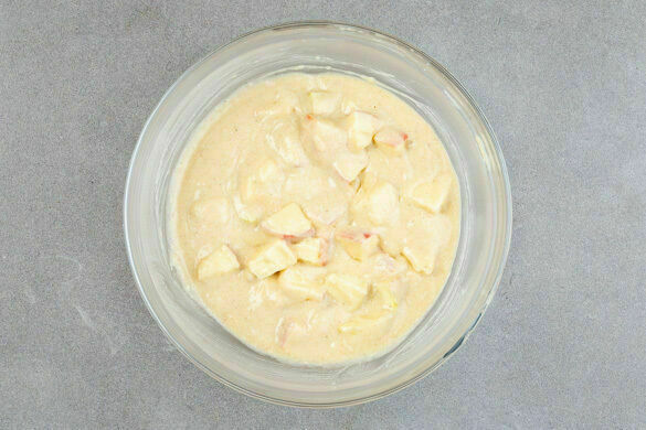 Weitere 60ml Milch mit 1 Ei und 2EL Pflanzenöl verquirlen, dann langsam unter den Teig rühren. ⅓ der Apfelstücke unterheben und alles gut vermengen.