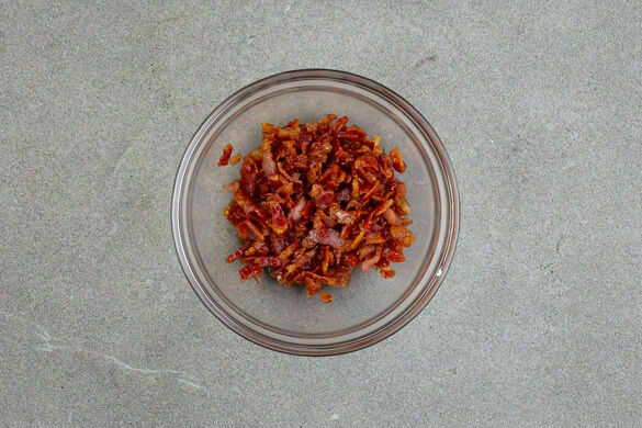 Den Speck ohne Zugabe von Fett in einer großen Pfanne bei mittlerer bis starker Hitze in 5–7Min. knusprig braten, dabei gelegentlich rühren. Anschließend aus der Pfanne nehmen, auf etwas Küchenkrepp abtropfen lassen und dann in einer Schüssel mit dem Ahornsirup vermengen.