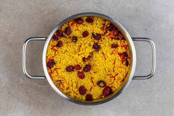 Den Topf vom Herd nehmen, den Couscous und die Cranberrys in das kochende Wasser rühren und abgedeckt 6–8Min. quellen lassen.