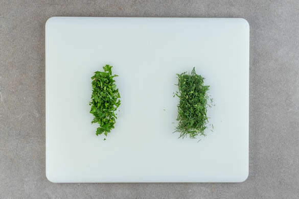 Die Petersilienblätter abzupfen und grob schneiden, die Stängel fein schneiden. Den Dill samt weichen Stängeln grob schneiden, härtere Stängel entfernen.