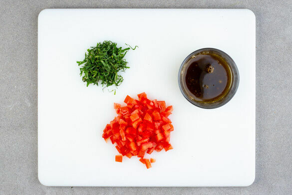 Die Tomate in ca. 0,5cm große Würfel schneiden. Die Minzeblätter von den Stängeln zupfen und fein schneiden. Die Granatapfelmelasse mit 2EL Olivenöl, 1TL Essig und 1 kräftigen Prise Salz zu einem Dressing verrühren.