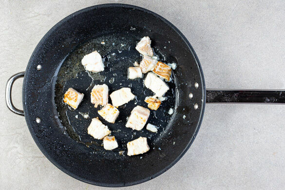 Den Fisch mit kaltem Wasser abspülen, trocken tupfen und evtl. vorhandene Gräten mit einer Pinzette entfernen, dann mit 2EL Mehl, 1/2TL Salz und 1 Prise Pfeffer vorsichtig vermengen. Das Brötchen 6–8Min. im Ofen aufbacken.
