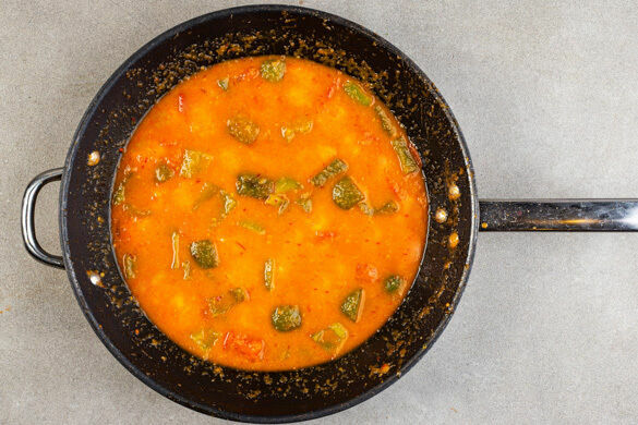 Die Paprika vierteln, entkernen, in 1–2cm große Würfel schneiden und mit den übrigen Tomaten kurz in der Pfanne mitbraten. Das Gemüse mit 250ml Wasser ablöschen und das Curry bei niedriger Hitze 12–15Min. einköcheln lassen.