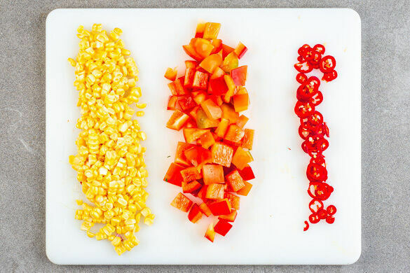 In einem mittelgroßen Topf 800ml Wasser mit dem Brühgewürz zum Kochen bringen. Die Maiskolben schälen, dabei ggf. vorhandene Härchen entfernen und den Mais von den Kolben schneiden. Die Paprika halbieren, entkernen und in ca. 2cm große Stücke schneiden. Die Chilischote in feine Ringe schneiden. Tipp: Für weniger Schärfe die Kerne entfernen.