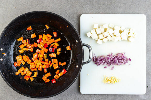 Die Paprika in derselben Pfanne mit 1EL Olivenöl bei mittlerer Hitze ca. 5Min. anbraten. Inzwischen die Zwiebeln schälen, halbieren und fein würfeln. Den Knoblauch schälen und fein reiben. Den Feta in ca. 2cm große Stücke schneiden.