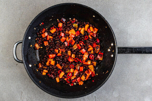 Die Bohnen in einem Sieb mit kaltem Wasser abspülen und abtropfen lassen, dann mit der Gewürzmischung, dem Knoblauch und den Chiliringen in die Pfanne geben und bei mittlerer bis niedriger Hitze ca. 2Min. erwärmen.
