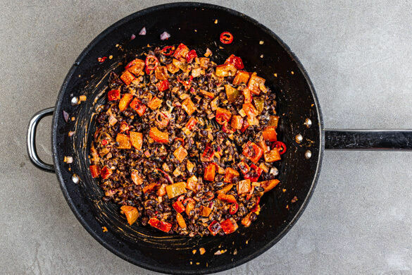 Dieses Chili bringt dir ordentlich Röstaromen auf den Tisch und das ganz ohne Hackfleisch! Das Geheimnis ist scharf angebratener, frischer Mais, der sich in seiner goldenen Süße an Paprika, schwarze Bohnen und würzigen Feta schmiegt. Thai-Chili und eine mexikanische Gewürzmischung sorgen für ein internationales Feuer auf der Zunge, spritzige Limette und duftender Koriander bringen mildernde Frische. Eine runde Sache!