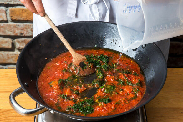 Den Knoblauch in einer großen Pfanne mit 1EL Olivenöl bei mittlerer Hitze ca. 30Sek. anbraten. Die gehackten Tomaten mit der 1/2 des Dills, 1EL Essig und 100ml Wasser hinzugeben. Das Gemüsebrühgewürz einrühren und die Sauce bei mittlerer Hitze 4–5Min. einköcheln lassen.