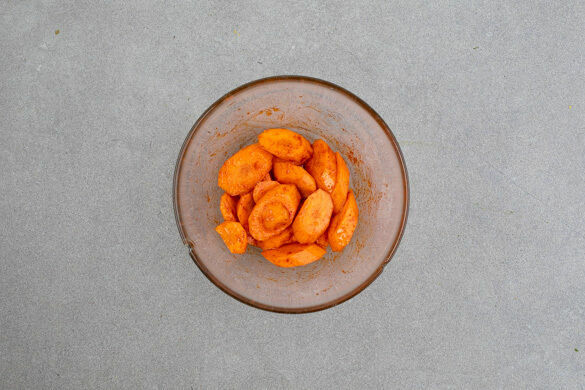 Die Karotte ggf. schälen und in dünne Scheiben schneiden. Die Karotten mit 1EL Olivenöl sowie je 1 kräftigen Prise Salz und geräuchertem Paprikapulver vermengen.