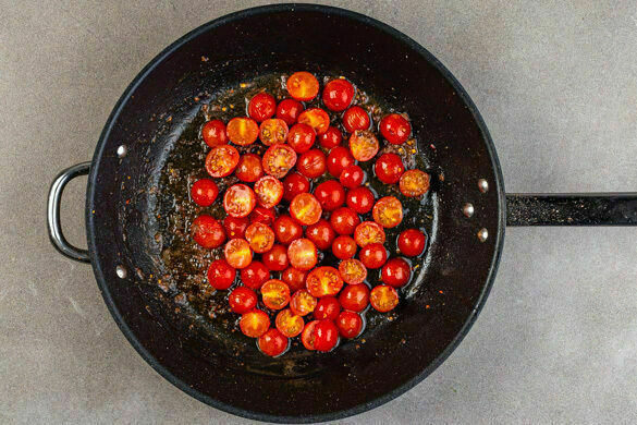 Die Kirschtomaten halbieren. 1EL Butter und 1EL Sardellenöl in der Pfanne bei mittlerer bis starker Hitze erwärmen. Die Tomaten, die Sardellen, die Knoblauchscheibchen und 1 Prise Chiliflocken in die Pfanne geben und 3–5Min. braten, bis die Sardellen sich auflösen und die Tomatenhäute aufplatzen. Die Sauce bis zum Servieren warm halten.