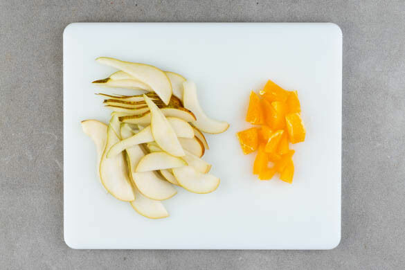 Die Orange mit einem Messer schälen, dabei auch die weiße Haut entfernen. Das Fruchtfleisch in mundgerechte Stücke schneiden. Die Birnen vierteln, entkernen und in dünne Scheiben schneiden.