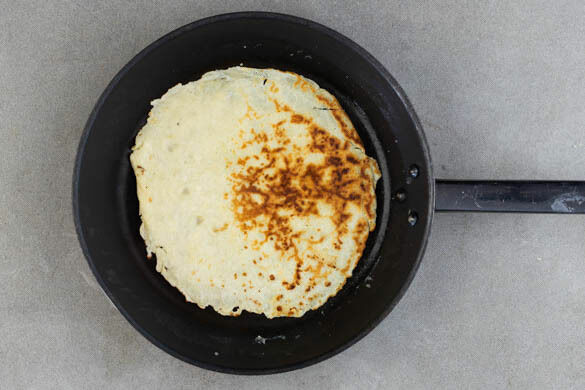 1TL Butter oder Pflanzenöl in eine große Pfanne geben und bei mittlerer Hitze erwärmen, eine Kelle Teig hineingeben und die Pfanne gleichmäßig bewegen, um ihn zu verteilen. Die Crêpe 1–2Min. backen, bis sie an den Rändern knusprig wird, dann wenden und zu Ende backen. Mit dem restlichen Teig ebenso verfahren, bis 8 Crêpes entstanden sind.