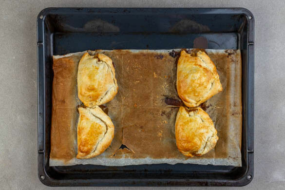 Den Teig mit dem Papier nach unten auf einem Backblech ausrollen und in 4 gleich große Stücke schneiden. Die Füllung auf den Teigstücken verteilen, den Teig quer über die Füllung schlagen und die Ränder fest verschließen, ggf. mit einer Gabel zusammendrücken. Tipp: Mit etwas Milch oder einem verquirlten Ei bestreichen, damit die Empanadas glänzen.