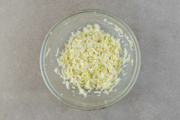 Den Backofen auf 220°C (200°C Umluft) vorheizen. 2EL Mayonnaise, 2EL hellen Essig, 2 kräftige Prisen Salz und 1 kräftige Prise Pfeffer glatt rühren. Den Fenchel mit einer Küchenreibe grob raspeln und umgehend mit der Mayonnaisecreme vermengen, damit er nicht braun wird. Tipp: Etwaige Fenchelreste klein schneiden und ebenfalls untermischen.