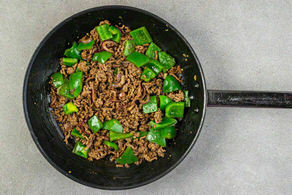 In einer großen Pfanne 2EL Olivenöl bei mittlerer bis starker Hitze erwärmen. Das Hackfleisch, ¾ der Zwiebeln, die Paprika, die Gewürzmischung und je 1 kräftige Prise Salz und Pfeffer in die Pfanne geben und 3–4Min. braten, bis das Hackfleisch zu bräunen beginnt.