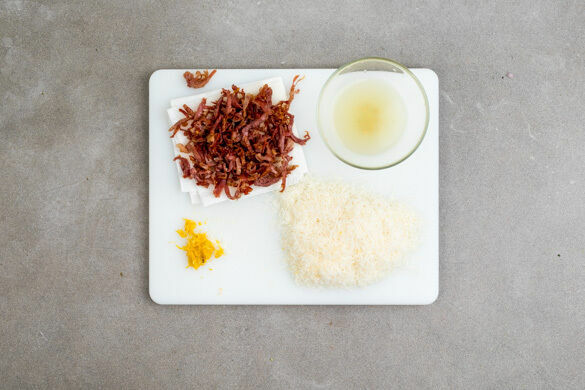 Die ½ des Schinkens in einer großen Pfanne mit 1EL Olivenöl bei mittlerer Hitze 3–4Min. goldbraun und knusprig braten. Auf etwas Küchenkrepp abtropfen lassen und für die Garnitur beiseitestellen. Die Pfanne aufbewahren. Die Zitronenschale abreiben, dann die Zitrone halbieren und auspressen. Den Käse fein reiben.