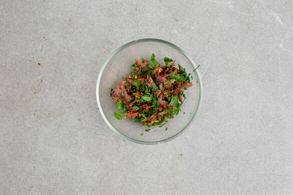 Den knusprig gebratenen Schinken mit ½TL Zitronenschale, der restlichen Petersilie und der Basilikumcreme vermengen. Die Pasta auf Tellern anrichten, mit der Schinken-Petersilien-Mischung und dem restlichen Käse garnieren und servieren.