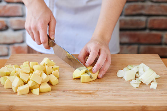 Den Ofen auf 180°C Ober-/Unterhitze vorheizen. Einen mittelgroßen Topf mit ausreichend gesalzenem Wasser zum Kochen bringen. Die Zwiebel und den Apfel schälen, Kerngehäuse herausschneiden und beides in ca. 2cm große Stücke schneiden.