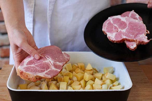 In der Auflaufform zuerst die Äpfel und die Zwiebeln verteilen und darauf den Kassler schichten. Im Ofen auf mittlerer Schiene ca. 30Min. backen.
