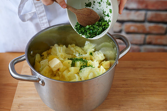 Wirsing und Kartoffeln in einem Sieb abtropfen und zurück in den Topf geben. Mit der Butter und der Petersilie vermengen und mit Salz und Pfeffer abschmecken.