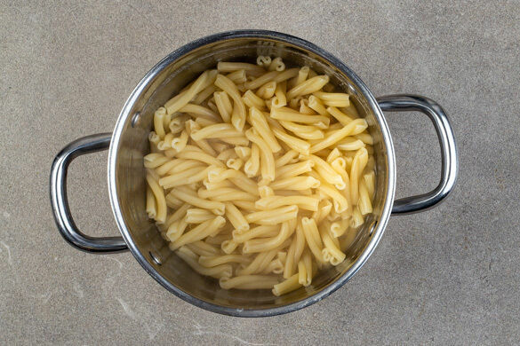 Den Backofen mit Grillfunktion auf 250°C vorheizen. In einem großen Topf ausreichend gesalzenes Wasser für die Pasta zum Kochen bringen. Die Pasta in das kochende Wasser geben und in 7–9Min. bissfest kochen. Ca. 150ml Pastawasser abschöpfen, dann die Pasta in ein Sieb abgießen und abtropfen lassen. Zurück in den Topf geben und abgedeckt beiseitestellen.