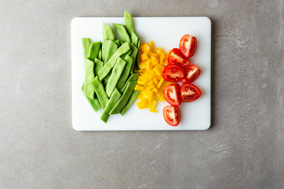 Die Enden der Kaiserschoten entfernen und die Kaiserschoten diagonal in 2–3cm lange Stücke schneiden. Die Paprika vierteln, entkernen und in ca. 2cm große Stücke schneiden. Die Tomaten vierteln, dabei den Strunk entfernen.