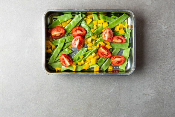 Die Kaiserschoten, die Paprika und die Tomaten in eine Auflaufform oder auf ein Backblech geben und mit 1EL Olivenöl sowie je 1 kräftigen Prise Salz und Pfeffer vermengen. Im Ofen 8–10Min. grillen, bis sich die Kaiserschoten dunkelgrün verfärben und die Paprika an den Enden leicht zu bräunen beginnt.